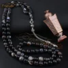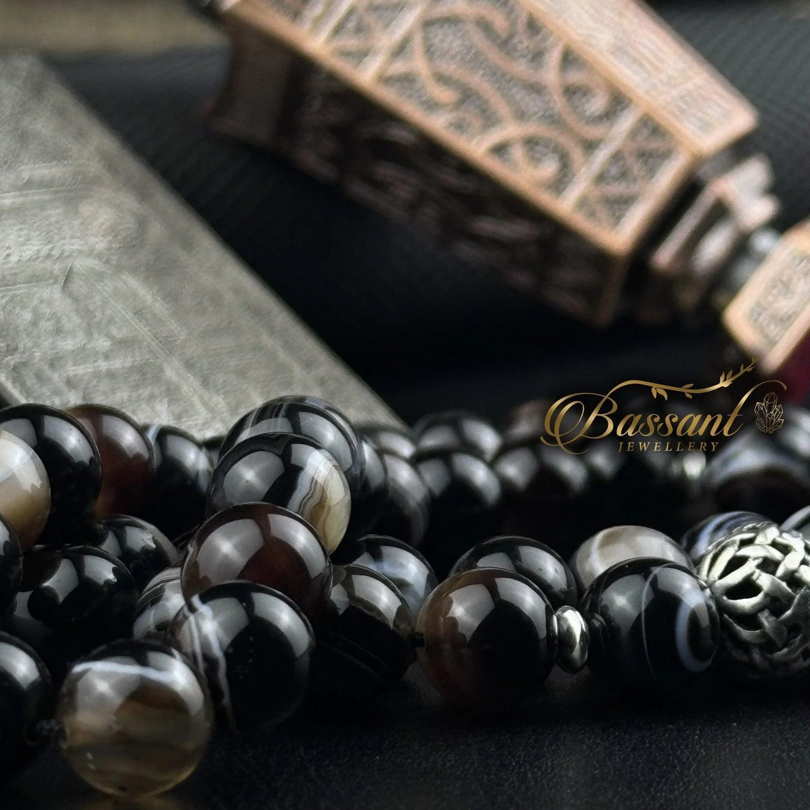 This rosary is meticulously crafted with the utmost precision, combining exceptional artistry and timeless elegance. The stunning Suleiman Agate gemstone, paired with 925k sterling silver, creates a mesmerizing fusion of beauty and craftsmanship. Each bead of Suleiman Agate is carefully selected for its contrasting bands of black, white, and grey, making each rosary a one-of-a-kind masterpiece.